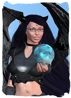 Blue gem imbedded in her forehead. Also her Eyes turn green when she uses her power over water or energy. A long thin black dragons tail which goes all the way to the floor and back up to about her knees in length and small horns. A mess of scars from her left wrist all the way up to her shoulder.